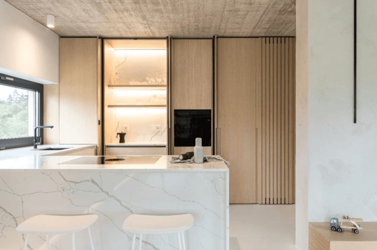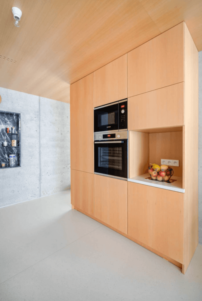 Tento interiér je postaven na použití překližky jako udržitelného, pevného a dlouhodobě funkčního materiálu, který přirozeně propojuje estetiku s každodenním provozem. Výsledkem je nadčasový prostor, který je lehký na pohled, udržitelný svou podstatou a připravený obstát v čase.