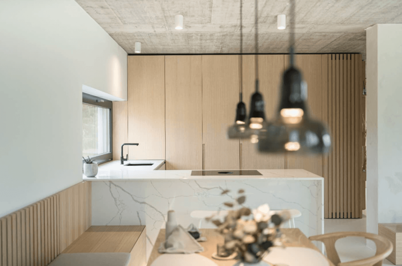 Zajímavým materiálem z pohledu udržitelnosti i praktického využití je také umělý kámen, který se díky své vysoké odolnosti, snadné údržbě a nadčasovému vzhledu uplatňuje v různých typech interiérů – od pracovních prostor až po reprezentativní zóny. Jeho potenciál ukazuje například realizace interiéru v japandi stylu od firmy Dřevodílo, kde materiál přirozeně doplňuje dřevo a podtrhuje klidný, funkční charakter prostoru. Právě schopnost kombinovat estetiku s dlouhou životností dělá z umělého kamene materiál, který dává smysl i v dlouhodobé perspektivě.