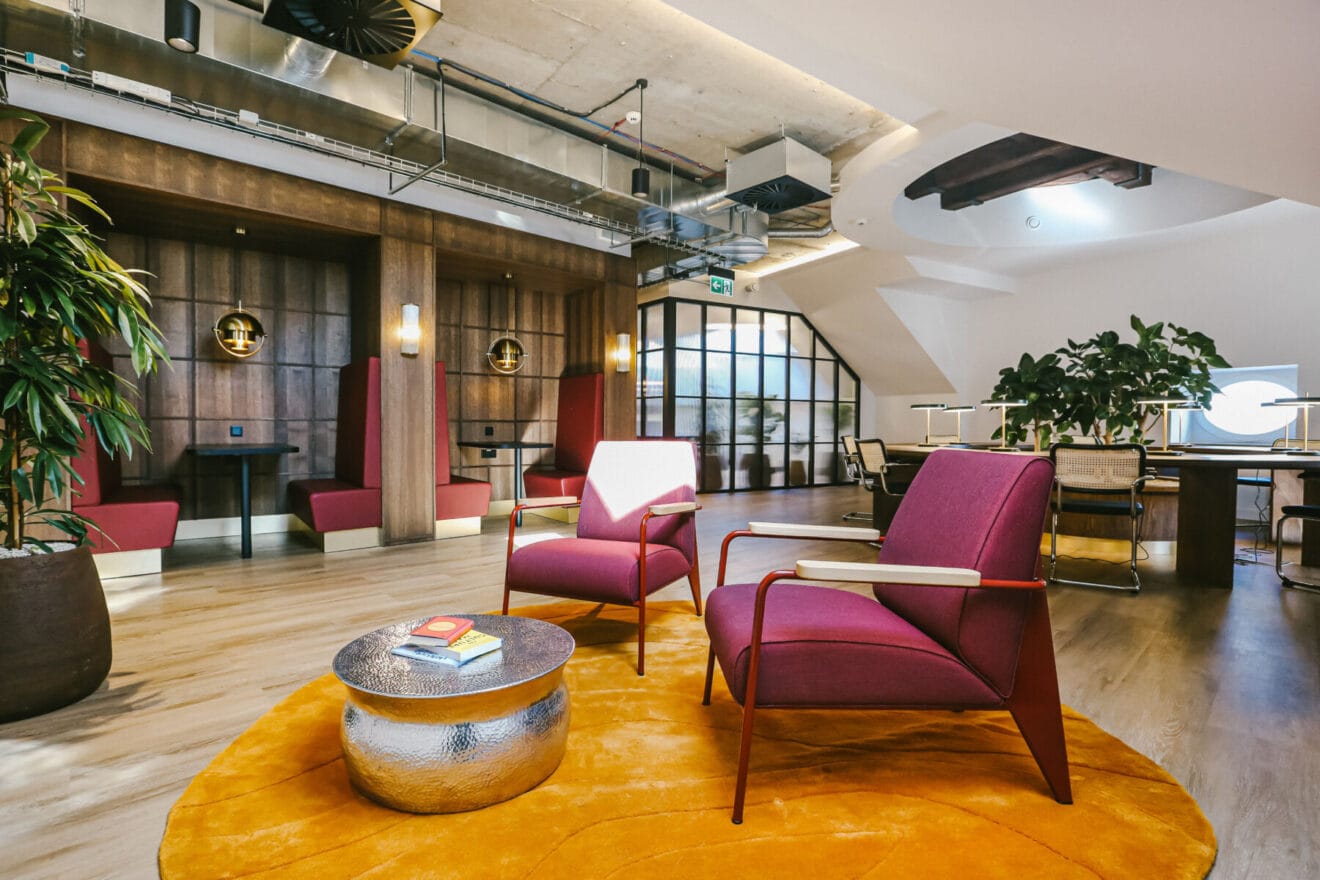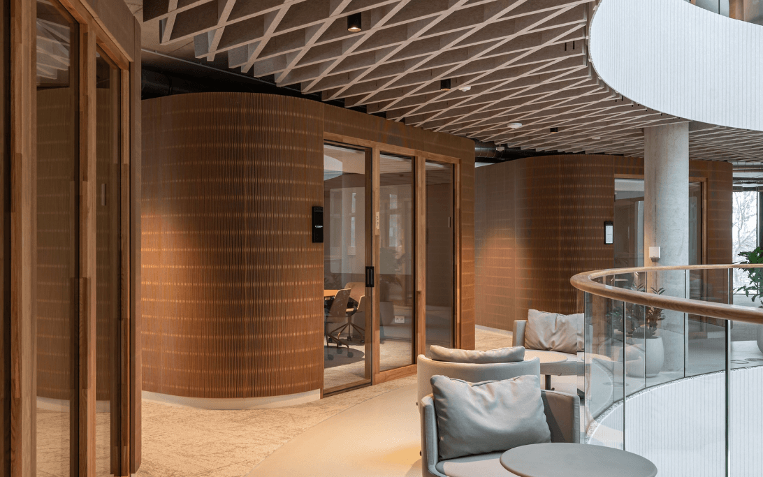 Tyto kanceláře naopak působí jako současný typ workspace. Je vidět členění na klidové zóny, polosoukromé meetingové prostory i neformální lounge části, takže uživatel si může vybrat režim práce podle aktuální potřeby. Díky materiálům, zeleni a měkčím prvkům prostor nepůsobí jako „pracoviště“, ale spíš jako pracovní prostředí, ve kterém lze fungovat celý den bez výrazné mentální únavy.